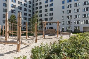 Камерные дворы квартала закрыты от машин. По нашим стандартам 70% их территории покрывает зелень. Деревья, кустарники и травы подобраны таким образом, чтобы в каждый сезон двор оставался красивым и имел свой цвет. Каждый двор разделён на зоны. В одной расположены детские площадки, в другой — места для спорта и тихого отдыха взрослых.