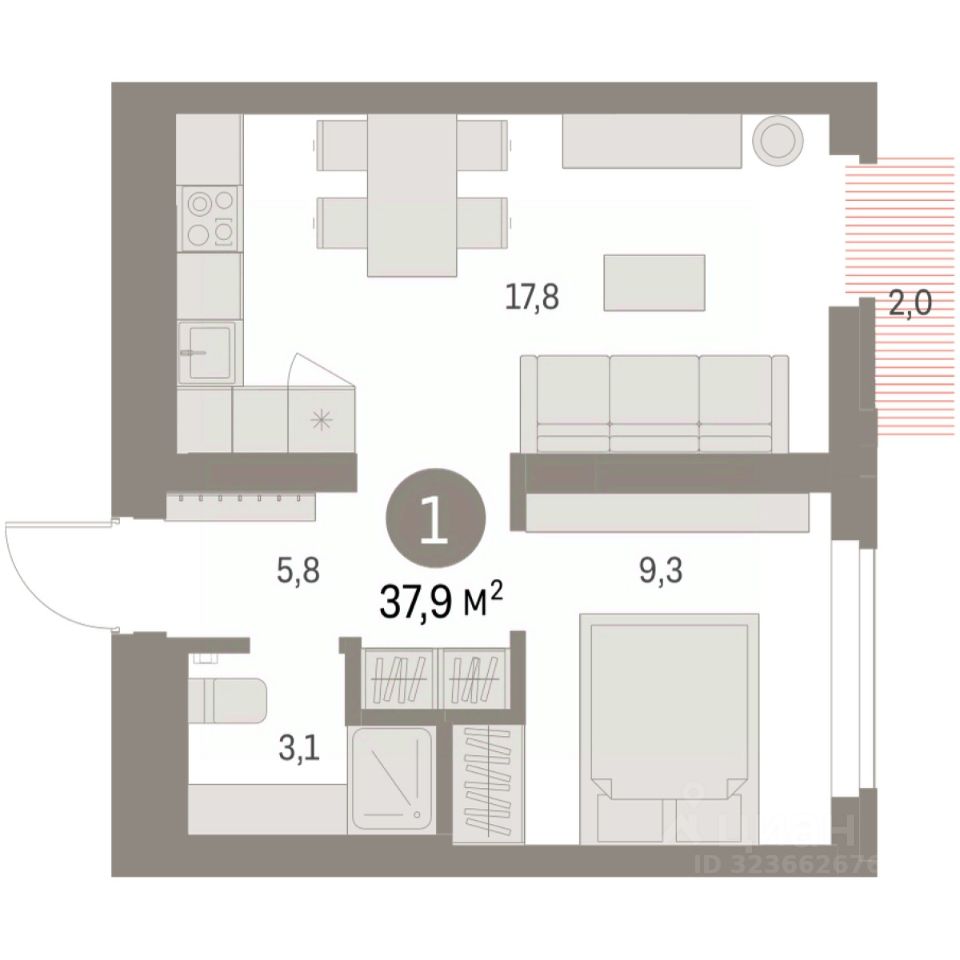 Квартира с кухней-гостиной и одной спальней в Бруснике в Академическом. Особенности планировки: предчистовая отделка, балкон.