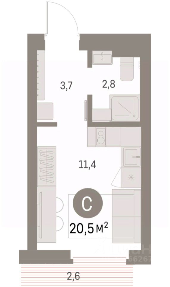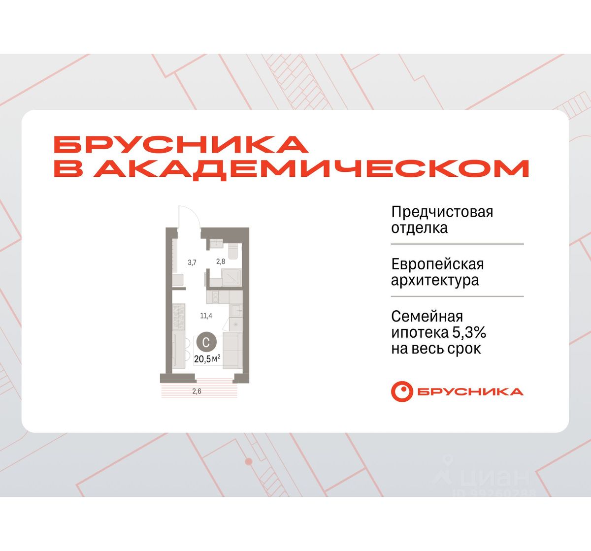 Студия в Бруснике в Академическом. Особенности планировки: предчистовая отделка, балкон.