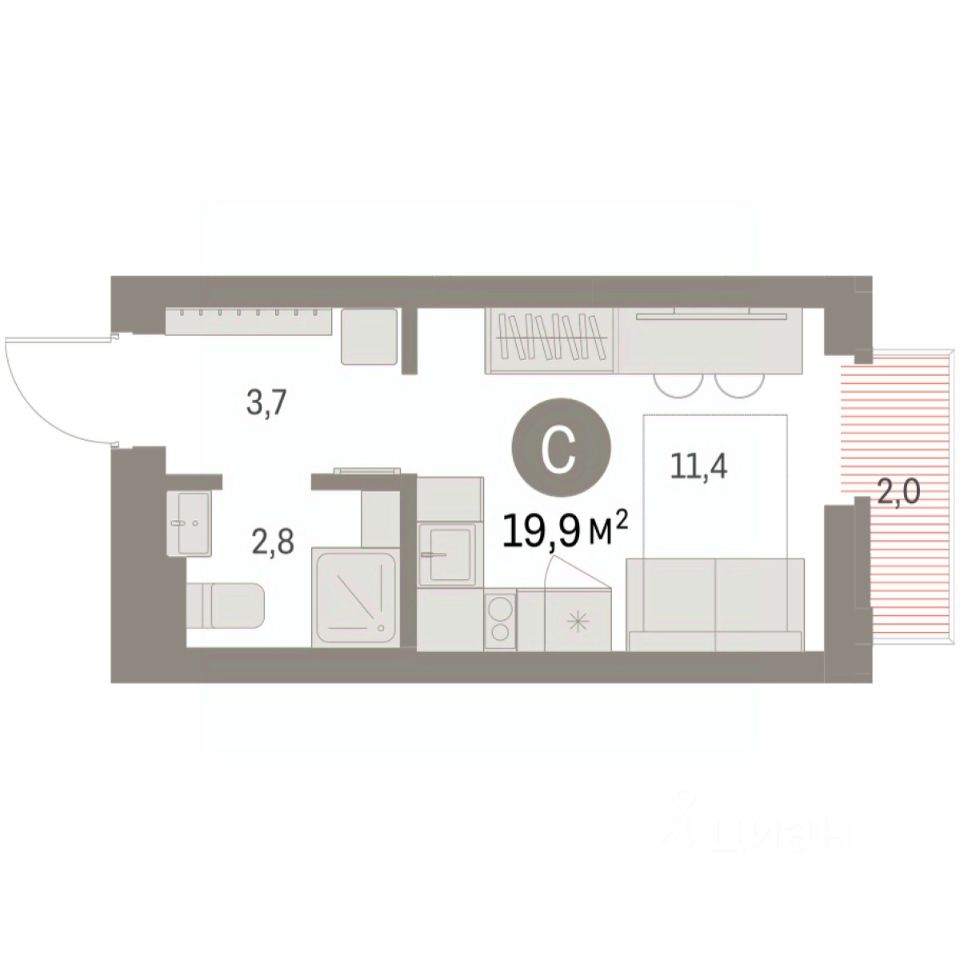 Студия в Бруснике в Академическом. Особенности планировки: предчистовая отделка, балкон.