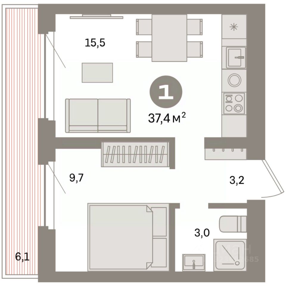 Квартира с кухней-гостиной и одной спальней в квартале "Депо". Особенности планировки: предчистовая отделка, терраса на крыше.