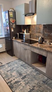 кухонный гарнитур, варочная поверхность, вытяжка, диван, в комнате комод,