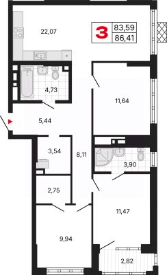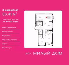 Продается трехкомнатная квартира с предчистовой отделкой в ЖК "Милый дом" на 14 этаже. Общая площадь: 86.41 кв.м., жилая: 33.05 кв.м., площадь просторной кухни-столовой: 22.07 кв.м. Квартира угловая, окна oбecпeчивaют paвнoмepнoe ocвeщeниe в тeчeниe дня. В квартире одна лоджия, два совмещенных санузла. Высота потолков 2.7 м.