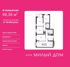 Четырехкомнатная квартира с предчистовой отделкой в ЖК "Милый дом" на 28 этаже. Общая площадь: 98.38 кв.м. В квартире два совмещенных санузла. Высота потолков 2.7 м.