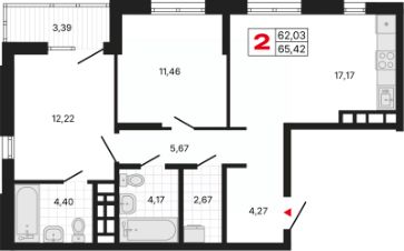 Просторная двухкомнатная квартира с предчистовой отделкой в ЖК "Милый дом" на 20 этаже. Общая площадь: 65.42 кв.м. В квартире два совмещенных санузла. Высота потолков 2.7 м.