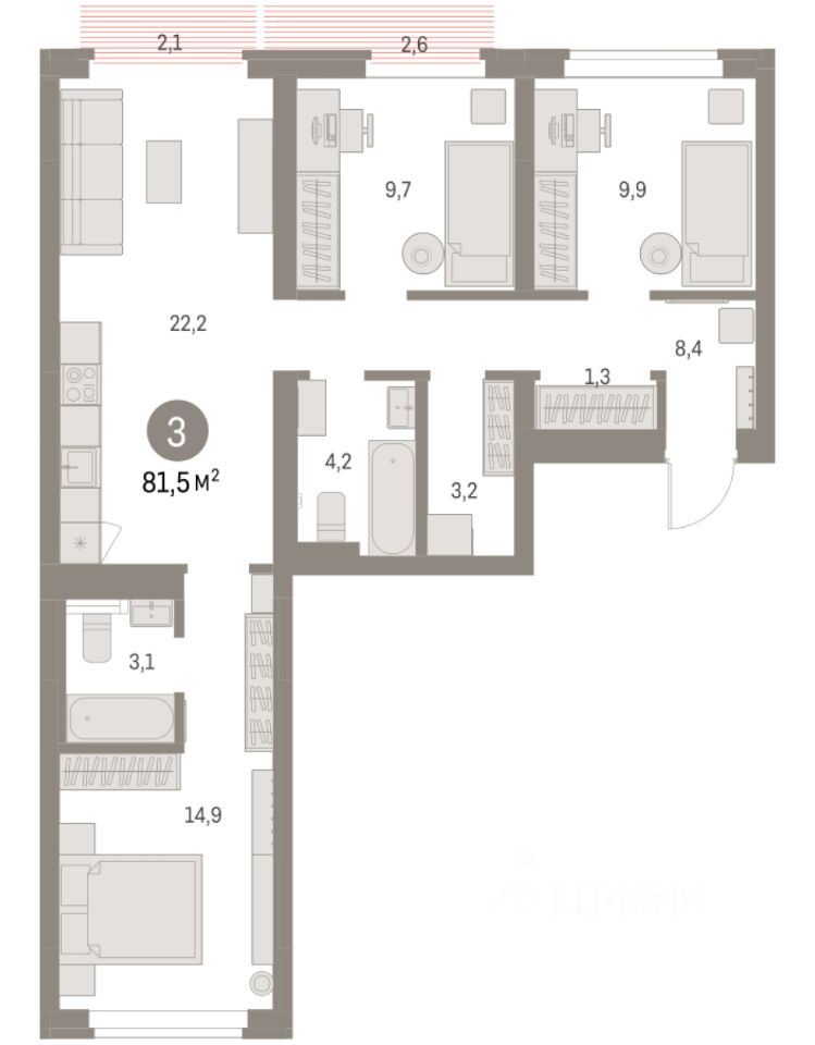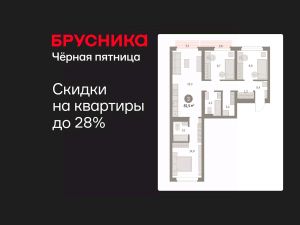 Квартира с кухней-гостиной и тремя спальнями в Бруснике в Академическом. Особенности планировки: второй санузел, гардеробная, вид во двор, разнесённые спальни, предчистовая отделка, мастер-спальня, постирочная, балкон.