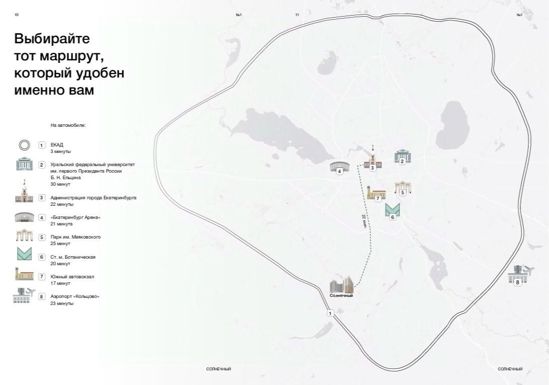 До ЕКАД - 3 мин, до аэропорта Кольцово 23 мин, до центра 22 мин.