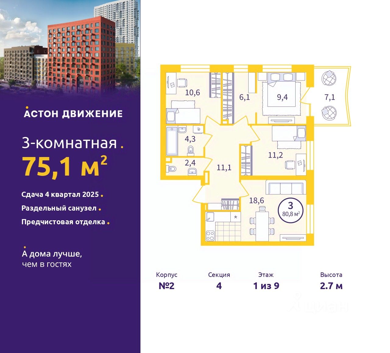 Трехкомнатная квартира от застройщика с предчистовой отделкой в ЖК "Астон.Движение" на 1 этаже. Общая площадь: 75.1 кв.м. Высота потолков 2.7 м.