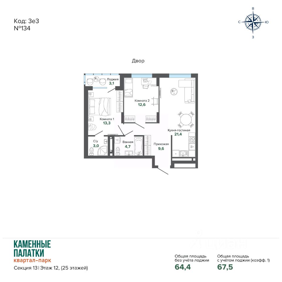 Общая площадь67,54 м²