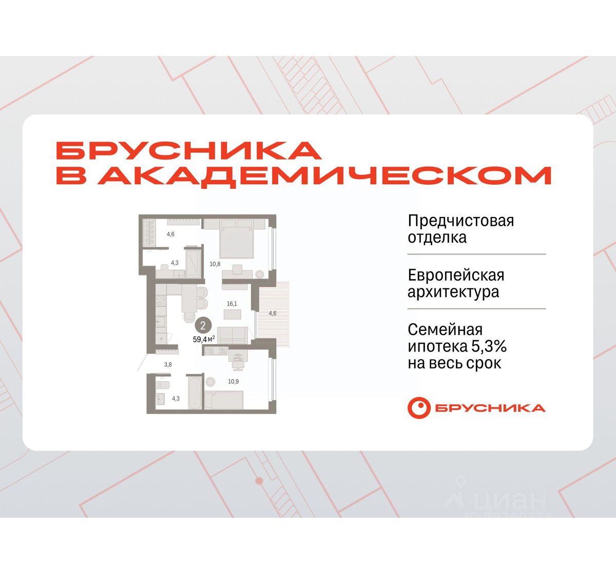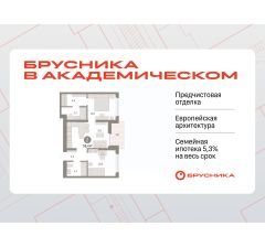 Квартира с кухней-гостиной и двумя спальнями в Бруснике в Академическом. Особенности планировки: второй санузел, гардеробная, разнесённые спальни, предчистовая отделка, мастер-спальня, балкон.