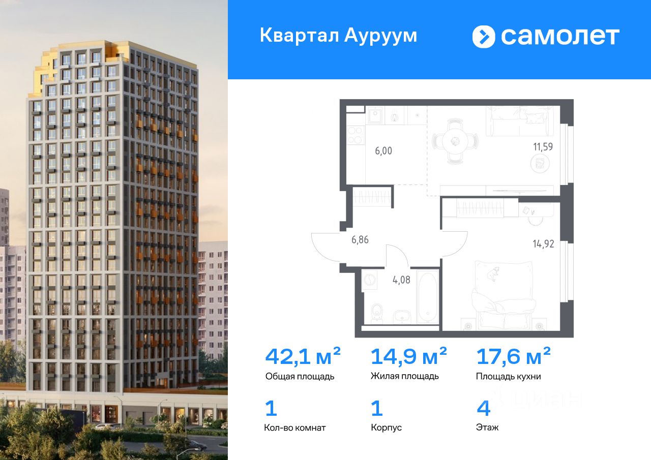 Строим кварталы для жизни с заботой о будущем. Предлагается 1-комнатная квартира бизнес-класса 42,1 кв.м в корпусе 1 на 4 этаже, в ЖК "Квартал Ауруум"
