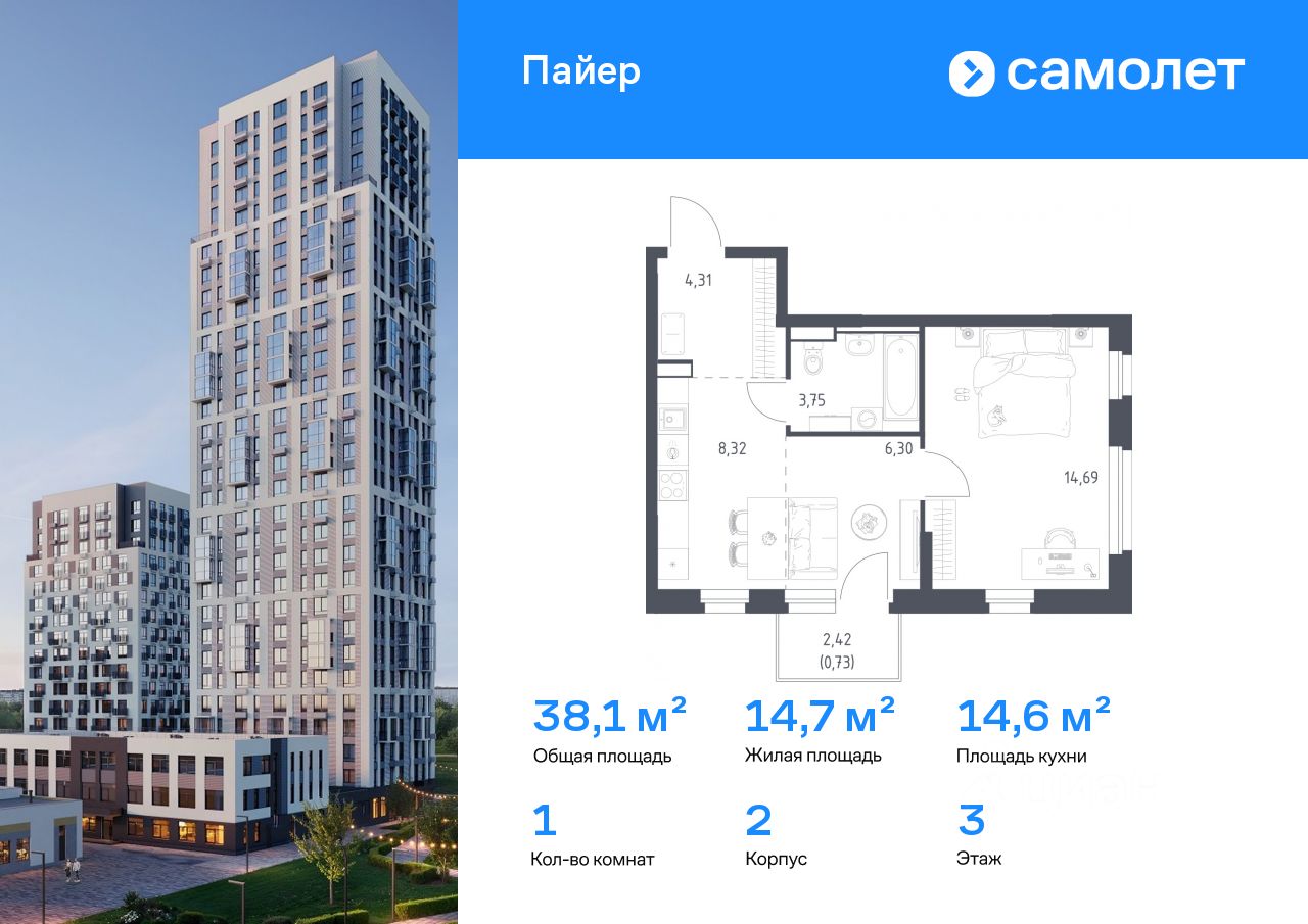 Строим кварталы для жизни с заботой о будущем. Предлагается 1-комнатная квартира комфорт-класса 38,1 кв.м в корпусе 2 на 3 этаже, в ЖК "Пайер"