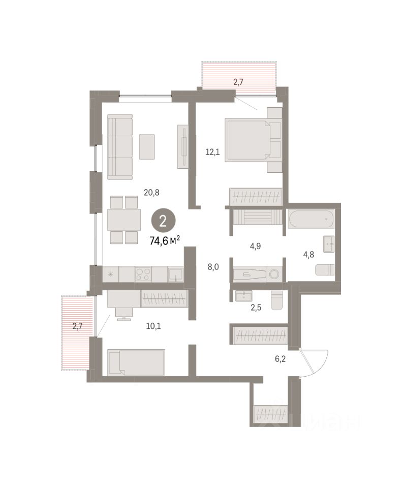 Квартира с кухней-гостиной и двумя спальнями в районе Шишимская горка. Особенности планировки: второй санузел, разнесённые спальни, предчистовая отделка, постирочная, балкон.