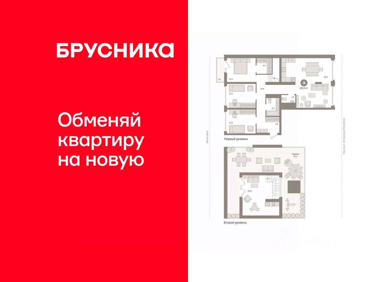 Квартира с кухней-гостиной и тремя спальнями в Южных кварталах. Особенности планировки: балкон, без отделки, двухуровневая, зенитное окно, окна на две стороны, терраса на крыше.