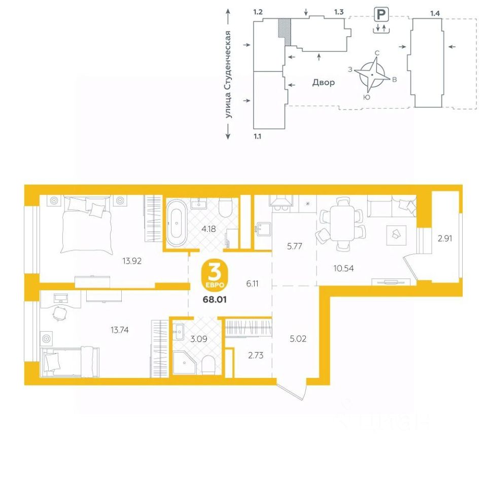 Предусмотрен подземный паркинг и кладовые. Срок сдачи 3 квартал 2026 г.