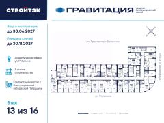 Удачные решения Новый квартал благоустроенной жизни "Гравитация" мы разместили в периметре улиц Рябинина и Академика Ландау. У квартала 5 этапов строительства, а всю работу мы завершим к 2030 году. Авторы проекта гармонично совместили в оформлении природные элементы и современный дизайн. Волнообразные очертания на стенах вдохновлены силой ветра и движением воды. Скруглённые углы подчеркивают элегантный силуэт, а контрастная палитра акцентов и контурная подсветка верхних этажей создают выразительный архитектурный образ. Первый этап строительства: — Секция 1.1 — 1 подъезд 26 этажей — Секция 1.2 — 2 подъезда 16 этажей — Секция 1.3 — 1 подъезд 12 этажей Здесь всё и сразу Гравитация — уютный и обособленный, и в то же время открытый и просторный квартал. Всё рядом: супермаркеты и парки, кино и рестораны, школы и сады. В нескольких шагах набережная реки Патрушихи. В квартале построят муниципальный детский сад на 200 мест, а на 5 этапе строительства мы возведём 6-уровневый надземный паркинг на 250 машин. На первых этажах домов для вас будет работать торговая галерея с магазинами, кафе и привычными бытовыми сервисами. В 1 этапе строительства 631 квартира. Своя вселенная Развитый Академический район удобен и молодым семьям, и школьникам, и состоявшимся профессионалам. Рядом большой Преображенский парк с озером и Юго-Западный лесопарк с Тропой здоровья. — 3 минуты до Гипер Ленты — 10 минут на машине до ТРЦ "Академический", 15 минут до ЕКАД, 25 до центра — 6 школ и 6 детских садов — Спортивные комплексы и клубы Wake up, Bright Fit и Юность Богатые возможности В квартале два просторных закрытых двора общей площадью 1,4 гектара. Один двор объединяет 1 и 2 этапы строительства, другой — 3, 4 и 5 этапы. Между дворами — камерная прогулочная аллея для неспешных вечеров или полуденного отдыха. Во дворе первого этапа — зелёные участки из хвойных деревьев, акцентных кустарников и травянистых многолетников, а также сеть дорожек, детская площадка с песочницей, аттракционами и геопластикой, настольный теннис и зона для зарядки. А для комфорта и безопасности — вечернее освещение, охрана и постоянное видеонаблюдение. Пространство с заботой В просторных светлых лобби Гравитации — интеллигентный дизайн, помещения для колясок, высокие витражи и комфортная мебель. Выходы сквозные, на улицу и во двор. Лифты грузоподъёмностью 1000 и 450 кг. Мы подготовили для вас 44 уникальных варианта продуманных планировок, в том числе с кухнями-гостиными, гардеробными и мастер-спальнями. Здесь нет бесполезных зон, зато есть где посидеть в семейном кругу и разместить всё для удобства и комфорта. Современные технологии Мы позаботились о достойной чистовой отделке, чтобы вы могли уделить время главному. — Виниловые обои на флизелиновой основе, окрашенные стены в санузлах и на лоджиях — Натяжные потолки везде, кроме лоджий, там — окрашенные — Прочный влагостойкий ламинат и керамическая плитка — Межкомнатные двери светлых тонов и сейф-дверь на входе — Эргономичное размещение розеток и выключателей