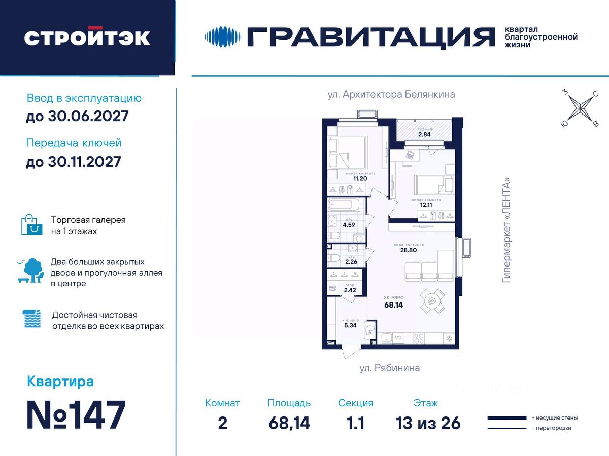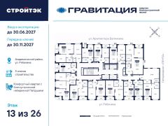 Удачные решения Новый квартал благоустроенной жизни "Гравитация" мы разместили в периметре улиц Рябинина и Академика Ландау. У квартала 5 этапов строительства, а всю работу мы завершим к 2030 году. Авторы проекта гармонично совместили в оформлении природные элементы и современный дизайн. Волнообразные очертания на стенах вдохновлены силой ветра и движением воды. Скруглённые углы подчеркивают элегантный силуэт, а контрастная палитра акцентов и контурная подсветка верхних этажей создают выразительный архитектурный образ. Первый этап строительства: — Секция 1.1 — 1 подъезд 26 этажей — Секция 1.2 — 2 подъезда 16 этажей — Секция 1.3 — 1 подъезд 12 этажей Здесь всё и сразу Гравитация — уютный и обособленный, и в то же время открытый и просторный квартал. Всё рядом: супермаркеты и парки, кино и рестораны, школы и сады. В нескольких шагах набережная реки Патрушихи. В квартале построят муниципальный детский сад на 200 мест, а на 5 этапе строительства мы возведём 6-уровневый надземный паркинг на 250 машин. На первых этажах домов для вас будет работать торговая галерея с магазинами, кафе и привычными бытовыми сервисами. В 1 этапе строительства 631 квартира. Своя вселенная Развитый Академический район удобен и молодым семьям, и школьникам, и состоявшимся профессионалам. Рядом большой Преображенский парк с озером и Юго-Западный лесопарк с Тропой здоровья. — 3 минуты до Гипер Ленты — 10 минут на машине до ТРЦ "Академический", 15 минут до ЕКАД, 25 до центра — 6 школ и 6 детских садов — Спортивные комплексы и клубы Wake up, Bright Fit и Юность Богатые возможности В квартале два просторных закрытых двора общей площадью 1,4 гектара. Один двор объединяет 1 и 2 этапы строительства, другой — 3, 4 и 5 этапы. Между дворами — камерная прогулочная аллея для неспешных вечеров или полуденного отдыха. Во дворе первого этапа — зелёные участки из хвойных деревьев, акцентных кустарников и травянистых многолетников, а также сеть дорожек, детская площадка с песочницей, аттракционами и геопластикой, настольный теннис и зона для зарядки. А для комфорта и безопасности — вечернее освещение, охрана и постоянное видеонаблюдение. Пространство с заботой В просторных светлых лобби Гравитации — интеллигентный дизайн, помещения для колясок, высокие витражи и комфортная мебель. Выходы сквозные, на улицу и во двор. Лифты грузоподъёмностью 1000 и 450 кг. Мы подготовили для вас 44 уникальных варианта продуманных планировок, в том числе с кухнями-гостиными, гардеробными и мастер-спальнями. Здесь нет бесполезных зон, зато есть где посидеть в семейном кругу и разместить всё для удобства и комфорта. Современные технологии Мы позаботились о достойной чистовой отделке, чтобы вы могли уделить время главному. — Виниловые обои на флизелиновой основе, окрашенные стены в санузлах и на лоджиях — Натяжные потолки везде, кроме лоджий, там — окрашенные — Прочный влагостойкий ламинат и керамическая плитка — Межкомнатные двери светлых тонов и сейф-дверь на входе — Эргономичное размещение розеток и выключателей
