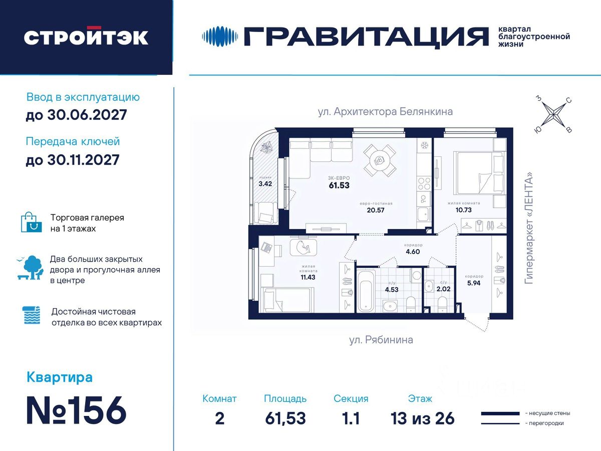 Удачные решения Новый квартал благоустроенной жизни "Гравитация" мы разместили в периметре улиц Рябинина и Академика Ландау. У квартала 5 этапов строительства, а всю работу мы завершим к 2030 году. Авторы проекта гармонично совместили в оформлении природные элементы и современный дизайн. Волнообразные очертания на стенах вдохновлены силой ветра и движением воды. Скруглённые углы подчеркивают элегантный силуэт, а контрастная палитра акцентов и контурная подсветка верхних этажей создают выразительный архитектурный образ. Первый этап строительства: — Секция 1.1 — 1 подъезд 26 этажей — Секция 1.2 — 2 подъезда 16 этажей — Секция 1.3 — 1 подъезд 12 этажей Здесь всё и сразу Гравитация — уютный и обособленный, и в то же время открытый и просторный квартал. Всё рядом: супермаркеты и парки, кино и рестораны, школы и сады. В нескольких шагах набережная реки Патрушихи. В квартале построят муниципальный детский сад на 200 мест, а на 5 этапе строительства мы возведём 6-уровневый надземный паркинг на 250 машин. На первых этажах домов для вас будет работать торговая галерея с магазинами, кафе и привычными бытовыми сервисами. В 1 этапе строительства 631 квартира. Своя вселенная Развитый Академический район удобен и молодым семьям, и школьникам, и состоявшимся профессионалам. Рядом большой Преображенский парк с озером и Юго-Западный лесопарк с Тропой здоровья. — 3 минуты до Гипер Ленты — 10 минут на машине до ТРЦ "Академический", 15 минут до ЕКАД, 25 до центра — 6 школ и 6 детских садов — Спортивные комплексы и клубы Wake up, Bright Fit и Юность Богатые возможности В квартале два просторных закрытых двора общей площадью 1,4 гектара. Один двор объединяет 1 и 2 этапы строительства, другой — 3, 4 и 5 этапы. Между дворами — камерная прогулочная аллея для неспешных вечеров или полуденного отдыха. Во дворе первого этапа — зелёные участки из хвойных деревьев, акцентных кустарников и травянистых многолетников, а также сеть дорожек, детская площадка с песочницей, аттракционами и геопластикой, настольный теннис и зона для зарядки. А для комфорта и безопасности — вечернее освещение, охрана и постоянное видеонаблюдение. Пространство с заботой В просторных светлых лобби Гравитации — интеллигентный дизайн, помещения для колясок, высокие витражи и комфортная мебель. Выходы сквозные, на улицу и во двор. Лифты грузоподъёмностью 1000 и 450 кг. Мы подготовили для вас 44 уникальных варианта продуманных планировок, в том числе с кухнями-гостиными, гардеробными и мастер-спальнями. Здесь нет бесполезных зон, зато есть где посидеть в семейном кругу и разместить всё для удобства и комфорта. Современные технологии Мы позаботились о достойной чистовой отделке, чтобы вы могли уделить время главному. — Виниловые обои на флизелиновой основе, окрашенные стены в санузлах и на лоджиях — Натяжные потолки везде, кроме лоджий, там — окрашенные — Прочный влагостойкий ламинат и керамическая плитка — Межкомнатные двери светлых тонов и сейф-дверь на входе — Эргономичное размещение розеток и выключателей