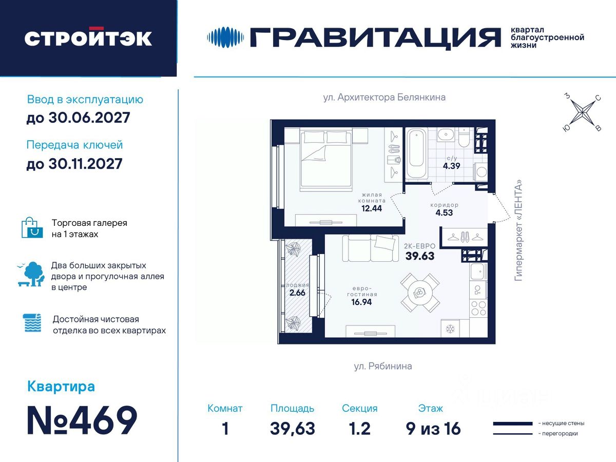 Удачные решения Новый квартал благоустроенной жизни "Гравитация" мы разместили в периметре улиц Рябинина и Академика Ландау. У квартала 5 этапов строительства, а всю работу мы завершим к 2030 году. Авторы проекта гармонично совместили в оформлении природные элементы и современный дизайн. Волнообразные очертания на стенах вдохновлены силой ветра и движением воды. Скруглённые углы подчеркивают элегантный силуэт, а контрастная палитра акцентов и контурная подсветка верхних этажей создают выразительный архитектурный образ. Первый этап строительства: — Секция 1.1 — 1 подъезд 26 этажей — Секция 1.2 — 2 подъезда 16 этажей — Секция 1.3 — 1 подъезд 12 этажей Здесь всё и сразу Гравитация — уютный и обособленный, и в то же время открытый и просторный квартал. Всё рядом: супермаркеты и парки, кино и рестораны, школы и сады. В нескольких шагах набережная реки Патрушихи. В квартале построят муниципальный детский сад на 200 мест, а на 5 этапе строительства мы возведём 6-уровневый надземный паркинг на 250 машин. На первых этажах домов для вас будет работать торговая галерея с магазинами, кафе и привычными бытовыми сервисами. В 1 этапе строительства 631 квартира. Своя вселенная Развитый Академический район удобен и молодым семьям, и школьникам, и состоявшимся профессионалам. Рядом большой Преображенский парк с озером и Юго-Западный лесопарк с Тропой здоровья. — 3 минуты до Гипер Ленты — 10 минут на машине до ТРЦ "Академический", 15 минут до ЕКАД, 25 до центра — 6 школ и 6 детских садов — Спортивные комплексы и клубы Wake up, Bright Fit и Юность Богатые возможности В квартале два просторных закрытых двора общей площадью 1,4 гектара. Один двор объединяет 1 и 2 этапы строительства, другой — 3, 4 и 5 этапы. Между дворами — камерная прогулочная аллея для неспешных вечеров или полуденного отдыха. Во дворе первого этапа — зелёные участки из хвойных деревьев, акцентных кустарников и травянистых многолетников, а также сеть дорожек, детская площадка с песочницей, аттракционами и геопластикой, настольный теннис и зона для зарядки. А для комфорта и безопасности — вечернее освещение, охрана и постоянное видеонаблюдение. Пространство с заботой В просторных светлых лобби Гравитации — интеллигентный дизайн, помещения для колясок, высокие витражи и комфортная мебель. Выходы сквозные, на улицу и во двор. Лифты грузоподъёмностью 1000 и 450 кг. Мы подготовили для вас 44 уникальных варианта продуманных планировок, в том числе с кухнями-гостиными, гардеробными и мастер-спальнями. Здесь нет бесполезных зон, зато есть где посидеть в семейном кругу и разместить всё для удобства и комфорта. Современные технологии Мы позаботились о достойной чистовой отделке, чтобы вы могли уделить время главному. — Виниловые обои на флизелиновой основе, окрашенные стены в санузлах и на лоджиях — Натяжные потолки везде, кроме лоджий, там — окрашенные — Прочный влагостойкий ламинат и керамическая плитка — Межкомнатные двери светлых тонов и сейф-дверь на входе — Эргономичное размещение розеток и выключателей