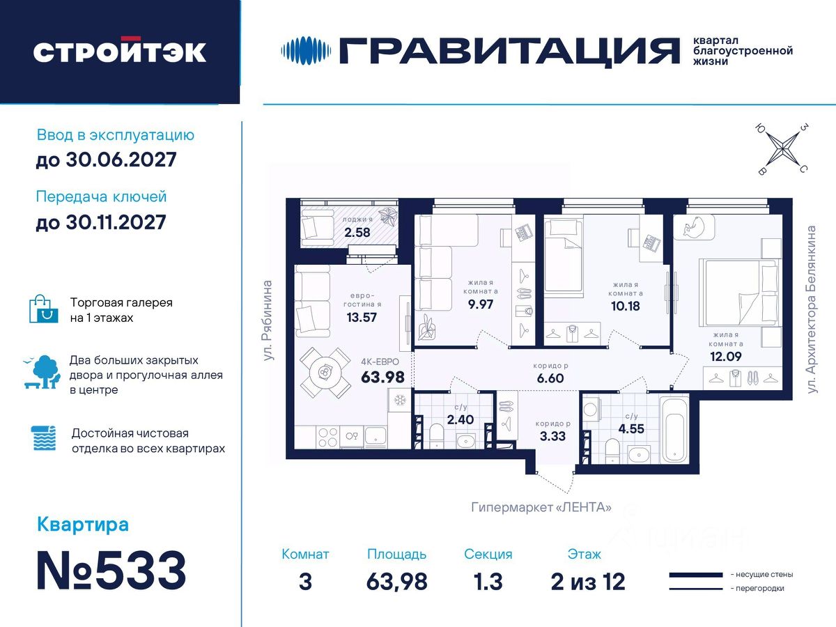 Удачные решения Новый квартал благоустроенной жизни "Гравитация" мы разместили в периметре улиц Рябинина и Академика Ландау. У квартала 5 этапов строительства, а всю работу мы завершим к 2030 году. Авторы проекта гармонично совместили в оформлении природные элементы и современный дизайн. Волнообразные очертания на стенах вдохновлены силой ветра и движением воды. Скруглённые углы подчеркивают элегантный силуэт, а контрастная палитра акцентов и контурная подсветка верхних этажей создают выразительный архитектурный образ. Первый этап строительства: — Секция 1.1 — 1 подъезд 26 этажей — Секция 1.2 — 2 подъезда 16 этажей — Секция 1.3 — 1 подъезд 12 этажей Здесь всё и сразу Гравитация — уютный и обособленный, и в то же время открытый и просторный квартал. Всё рядом: супермаркеты и парки, кино и рестораны, школы и сады. В нескольких шагах набережная реки Патрушихи. В квартале построят муниципальный детский сад на 200 мест, а на 5 этапе строительства мы возведём 6-уровневый надземный паркинг на 250 машин. На первых этажах домов для вас будет работать торговая галерея с магазинами, кафе и привычными бытовыми сервисами. В 1 этапе строительства 631 квартира. Своя вселенная Развитый Академический район удобен и молодым семьям, и школьникам, и состоявшимся профессионалам. Рядом большой Преображенский парк с озером и Юго-Западный лесопарк с Тропой здоровья. — 3 минуты до Гипер Ленты — 10 минут на машине до ТРЦ "Академический", 15 минут до ЕКАД, 25 до центра — 6 школ и 6 детских садов — Спортивные комплексы и клубы Wake up, Bright Fit и Юность Богатые возможности В квартале два просторных закрытых двора общей площадью 1,4 гектара. Один двор объединяет 1 и 2 этапы строительства, другой — 3, 4 и 5 этапы. Между дворами — камерная прогулочная аллея для неспешных вечеров или полуденного отдыха. Во дворе первого этапа — зелёные участки из хвойных деревьев, акцентных кустарников и травянистых многолетников, а также сеть дорожек, детская площадка с песочницей, аттракционами и геопластикой, настольный теннис и зона для зарядки. А для комфорта и безопасности — вечернее освещение, охрана и постоянное видеонаблюдение. Пространство с заботой В просторных светлых лобби Гравитации — интеллигентный дизайн, помещения для колясок, высокие витражи и комфортная мебель. Выходы сквозные, на улицу и во двор. Лифты грузоподъёмностью 1000 и 450 кг. Мы подготовили для вас 44 уникальных варианта продуманных планировок, в том числе с кухнями-гостиными, гардеробными и мастер-спальнями. Здесь нет бесполезных зон, зато есть где посидеть в семейном кругу и разместить всё для удобства и комфорта. Современные технологии Мы позаботились о достойной чистовой отделке, чтобы вы могли уделить время главному. — Виниловые обои на флизелиновой основе, окрашенные стены в санузлах и на лоджиях — Натяжные потолки везде, кроме лоджий, там — окрашенные — Прочный влагостойкий ламинат и керамическая плитка — Межкомнатные двери светлых тонов и сейф-дверь на входе — Эргономичное размещение розеток и выключателей