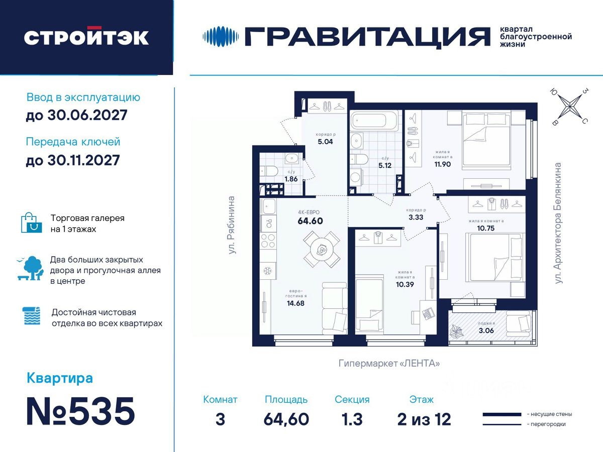 Удачные решения Новый квартал благоустроенной жизни "Гравитация" мы разместили в периметре улиц Рябинина и Академика Ландау. У квартала 5 этапов строительства, а всю работу мы завершим к 2030 году. Авторы проекта гармонично совместили в оформлении природные элементы и современный дизайн. Волнообразные очертания на стенах вдохновлены силой ветра и движением воды. Скруглённые углы подчеркивают элегантный силуэт, а контрастная палитра акцентов и контурная подсветка верхних этажей создают выразительный архитектурный образ. Первый этап строительства: — Секция 1.1 — 1 подъезд 26 этажей — Секция 1.2 — 2 подъезда 16 этажей — Секция 1.3 — 1 подъезд 12 этажей Здесь всё и сразу Гравитация — уютный и обособленный, и в то же время открытый и просторный квартал. Всё рядом: супермаркеты и парки, кино и рестораны, школы и сады. В нескольких шагах набережная реки Патрушихи. В квартале построят муниципальный детский сад на 200 мест, а на 5 этапе строительства мы возведём 6-уровневый надземный паркинг на 250 машин. На первых этажах домов для вас будет работать торговая галерея с магазинами, кафе и привычными бытовыми сервисами. В 1 этапе строительства 631 квартира. Своя вселенная Развитый Академический район удобен и молодым семьям, и школьникам, и состоявшимся профессионалам. Рядом большой Преображенский парк с озером и Юго-Западный лесопарк с Тропой здоровья. — 3 минуты до Гипер Ленты — 10 минут на машине до ТРЦ "Академический", 15 минут до ЕКАД, 25 до центра — 6 школ и 6 детских садов — Спортивные комплексы и клубы Wake up, Bright Fit и Юность Богатые возможности В квартале два просторных закрытых двора общей площадью 1,4 гектара. Один двор объединяет 1 и 2 этапы строительства, другой — 3, 4 и 5 этапы. Между дворами — камерная прогулочная аллея для неспешных вечеров или полуденного отдыха. Во дворе первого этапа — зелёные участки из хвойных деревьев, акцентных кустарников и травянистых многолетников, а также сеть дорожек, детская площадка с песочницей, аттракционами и геопластикой, настольный теннис и зона для зарядки. А для комфорта и безопасности — вечернее освещение, охрана и постоянное видеонаблюдение. Пространство с заботой В просторных светлых лобби Гравитации — интеллигентный дизайн, помещения для колясок, высокие витражи и комфортная мебель. Выходы сквозные, на улицу и во двор. Лифты грузоподъёмностью 1000 и 450 кг. Мы подготовили для вас 44 уникальных варианта продуманных планировок, в том числе с кухнями-гостиными, гардеробными и мастер-спальнями. Здесь нет бесполезных зон, зато есть где посидеть в семейном кругу и разместить всё для удобства и комфорта. Современные технологии Мы позаботились о достойной чистовой отделке, чтобы вы могли уделить время главному. — Виниловые обои на флизелиновой основе, окрашенные стены в санузлах и на лоджиях — Натяжные потолки везде, кроме лоджий, там — окрашенные — Прочный влагостойкий ламинат и керамическая плитка — Межкомнатные двери светлых тонов и сейф-дверь на входе — Эргономичное размещение розеток и выключателей