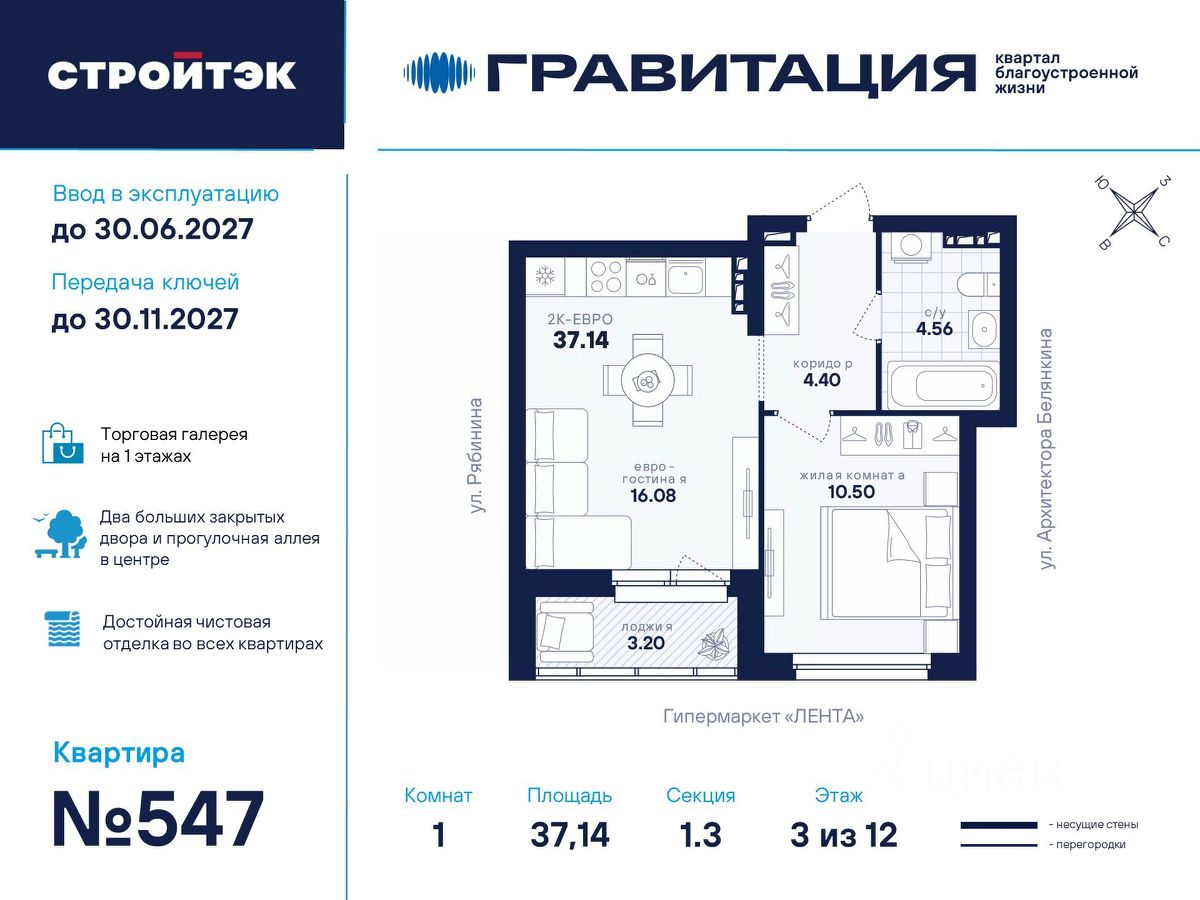 Удачные решения Новый квартал благоустроенной жизни "Гравитация" мы разместили в периметре улиц Рябинина и Академика Ландау. У квартала 5 этапов строительства, а всю работу мы завершим к 2030 году. Авторы проекта гармонично совместили в оформлении природные элементы и современный дизайн. Волнообразные очертания на стенах вдохновлены силой ветра и движением воды. Скруглённые углы подчеркивают элегантный силуэт, а контрастная палитра акцентов и контурная подсветка верхних этажей создают выразительный архитектурный образ. Первый этап строительства: — Секция 1.1 — 1 подъезд 26 этажей — Секция 1.2 — 2 подъезда 16 этажей — Секция 1.3 — 1 подъезд 12 этажей Здесь всё и сразу Гравитация — уютный и обособленный, и в то же время открытый и просторный квартал. Всё рядом: супермаркеты и парки, кино и рестораны, школы и сады. В нескольких шагах набережная реки Патрушихи. В квартале построят муниципальный детский сад на 200 мест, а на 5 этапе строительства мы возведём 6-уровневый надземный паркинг на 250 машин. На первых этажах домов для вас будет работать торговая галерея с магазинами, кафе и привычными бытовыми сервисами. В 1 этапе строительства 631 квартира. Своя вселенная Развитый Академический район удобен и молодым семьям, и школьникам, и состоявшимся профессионалам. Рядом большой Преображенский парк с озером и Юго-Западный лесопарк с Тропой здоровья. — 3 минуты до Гипер Ленты — 10 минут на машине до ТРЦ "Академический", 15 минут до ЕКАД, 25 до центра — 6 школ и 6 детских садов — Спортивные комплексы и клубы Wake up, Bright Fit и Юность Богатые возможности В квартале два просторных закрытых двора общей площадью 1,4 гектара. Один двор объединяет 1 и 2 этапы строительства, другой — 3, 4 и 5 этапы. Между дворами — камерная прогулочная аллея для неспешных вечеров или полуденного отдыха. Во дворе первого этапа — зелёные участки из хвойных деревьев, акцентных кустарников и травянистых многолетников, а также сеть дорожек, детская площадка с песочницей, аттракционами и геопластикой, настольный теннис и зона для зарядки. А для комфорта и безопасности — вечернее освещение, охрана и постоянное видеонаблюдение. Пространство с заботой В просторных светлых лобби Гравитации — интеллигентный дизайн, помещения для колясок, высокие витражи и комфортная мебель. Выходы сквозные, на улицу и во двор. Лифты грузоподъёмностью 1000 и 450 кг. Мы подготовили для вас 44 уникальных варианта продуманных планировок, в том числе с кухнями-гостиными, гардеробными и мастер-спальнями. Здесь нет бесполезных зон, зато есть где посидеть в семейном кругу и разместить всё для удобства и комфорта. Современные технологии Мы позаботились о достойной чистовой отделке, чтобы вы могли уделить время главному. — Виниловые обои на флизелиновой основе, окрашенные стены в санузлах и на лоджиях — Натяжные потолки везде, кроме лоджий, там — окрашенные — Прочный влагостойкий ламинат и керамическая плитка — Межкомнатные двери светлых тонов и сейф-дверь на входе — Эргономичное размещение розеток и выключателей