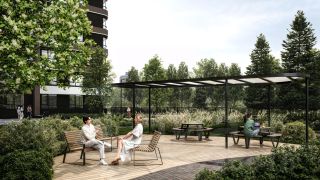 Во дворе первого этапа — зелёные участки из хвойных деревьев, акцентных кустарников и травянистых многолетников, а также сеть дорожек, детская площадка с песочницей, аттракционами и геопластикой, настольный теннис и зона для зарядки.