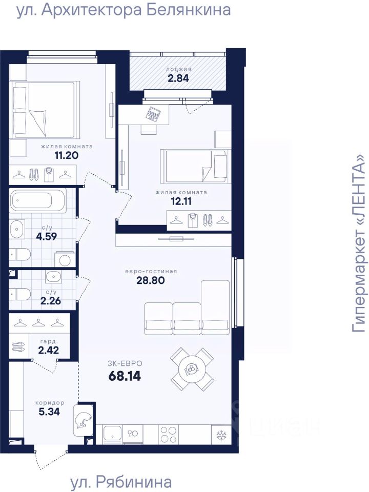Продаётся 2-комнатная квартира в строящемся доме (Дом 1), срок сдачи: II-кв. 2027, общей площадью 68.14 кв.м., на 9 этаже. Новый жилой комплекс "Гравитация" от застройщика "Стройтэк" расположен по адресу: г. Екатеринбург, улица Рябинина.