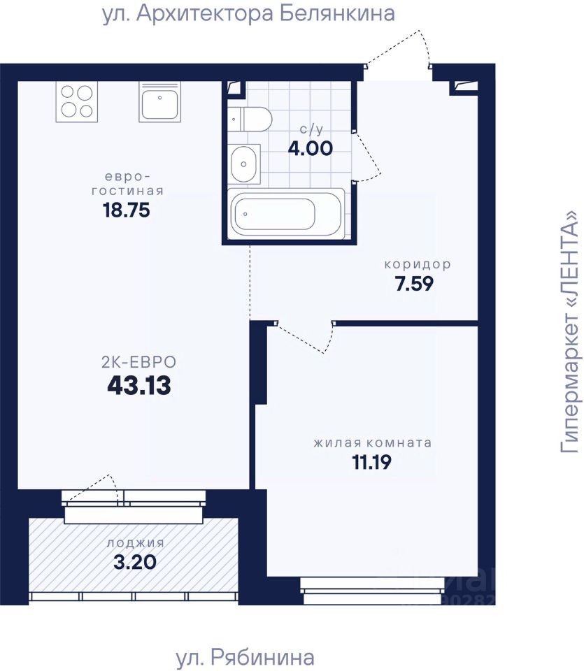 Общая площадь43,13 м²