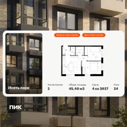 Продаётся 2-комн. квартира площадью 45,4 кв.м на 24 этаже 24 этажного дома (Корпус 5, Секция 1) проекта ПИК Исеть парк. Светлый просторный подъезд на уровне земли, функциональная планировка, большие окна, предчистовая отделка.