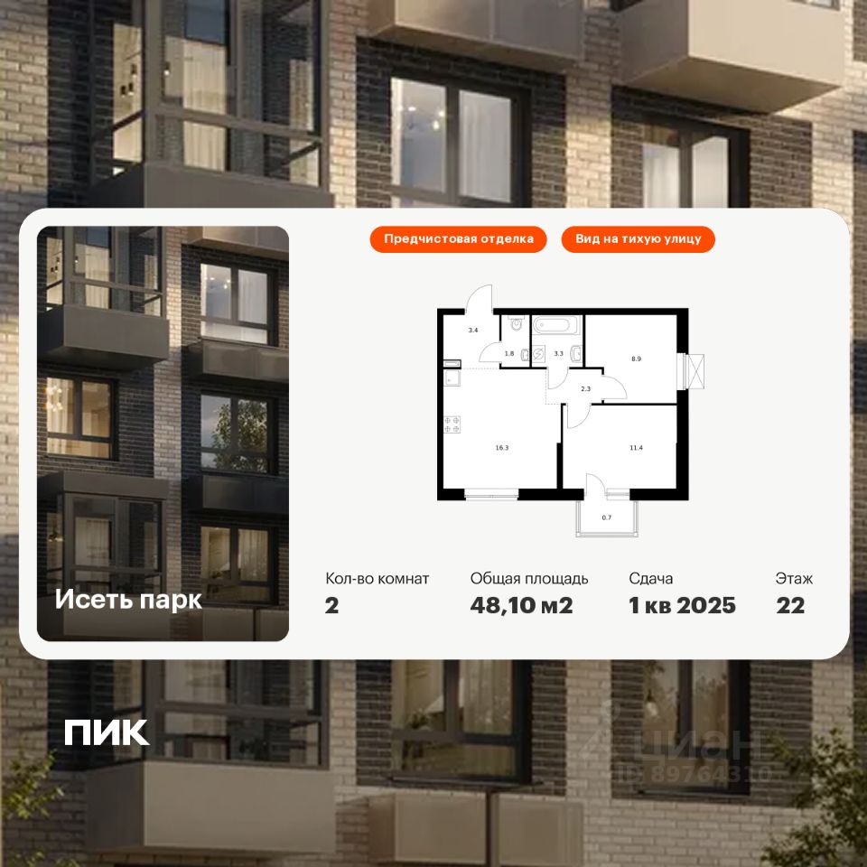 Продаётся 2-комн. квартира площадью 48,1 кв.м на 22 этаже 24 этажного дома (Корпус 6, Секция 1) проекта ПИК Исеть парк. Светлый просторный подъезд на уровне земли, функциональная планировка, большие окна, предчистовая отделка.