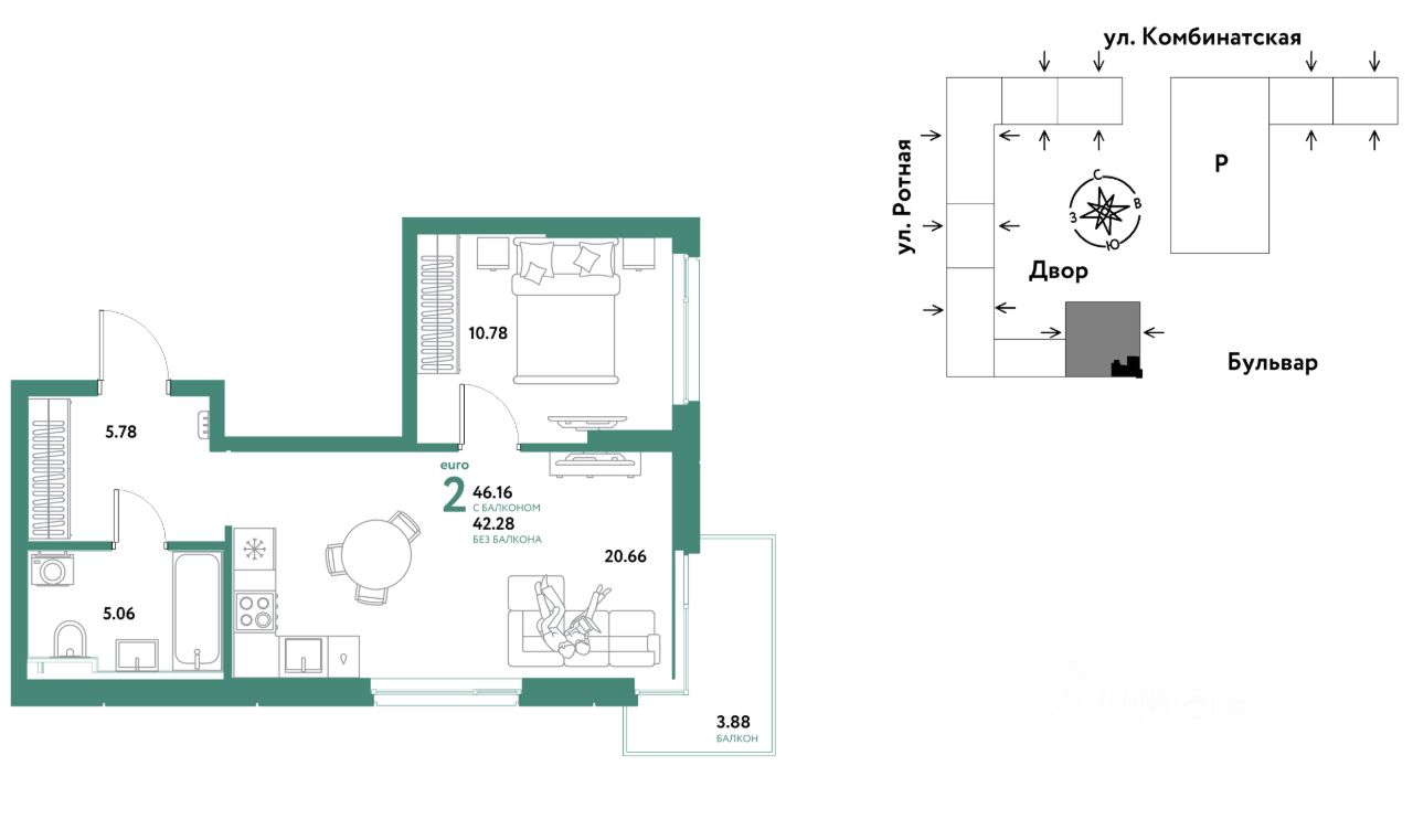 2комнатная квартира площадью 46,16кв. м. на 3 этаже жилого комплекса "Уральский сад".