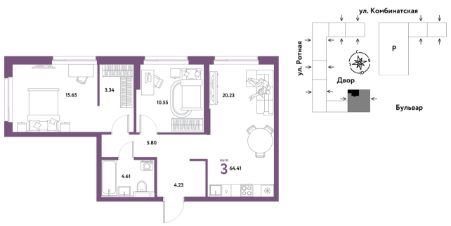 3комнатная квартира площадью 64,41кв. м. на 3 этаже жилого комплекса "Уральский сад".