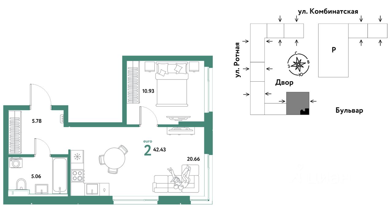 2комнатная квартира площадью 42,43кв. м. на 4 этаже жилого комплекса "Уральский сад".