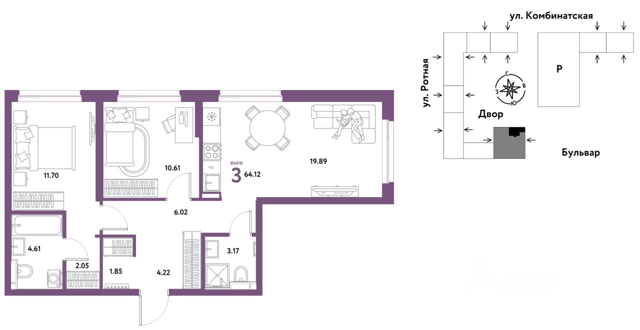 3комнатная квартира площадью 64,12кв. м. на 5 этаже жилого комплекса "Уральский сад".