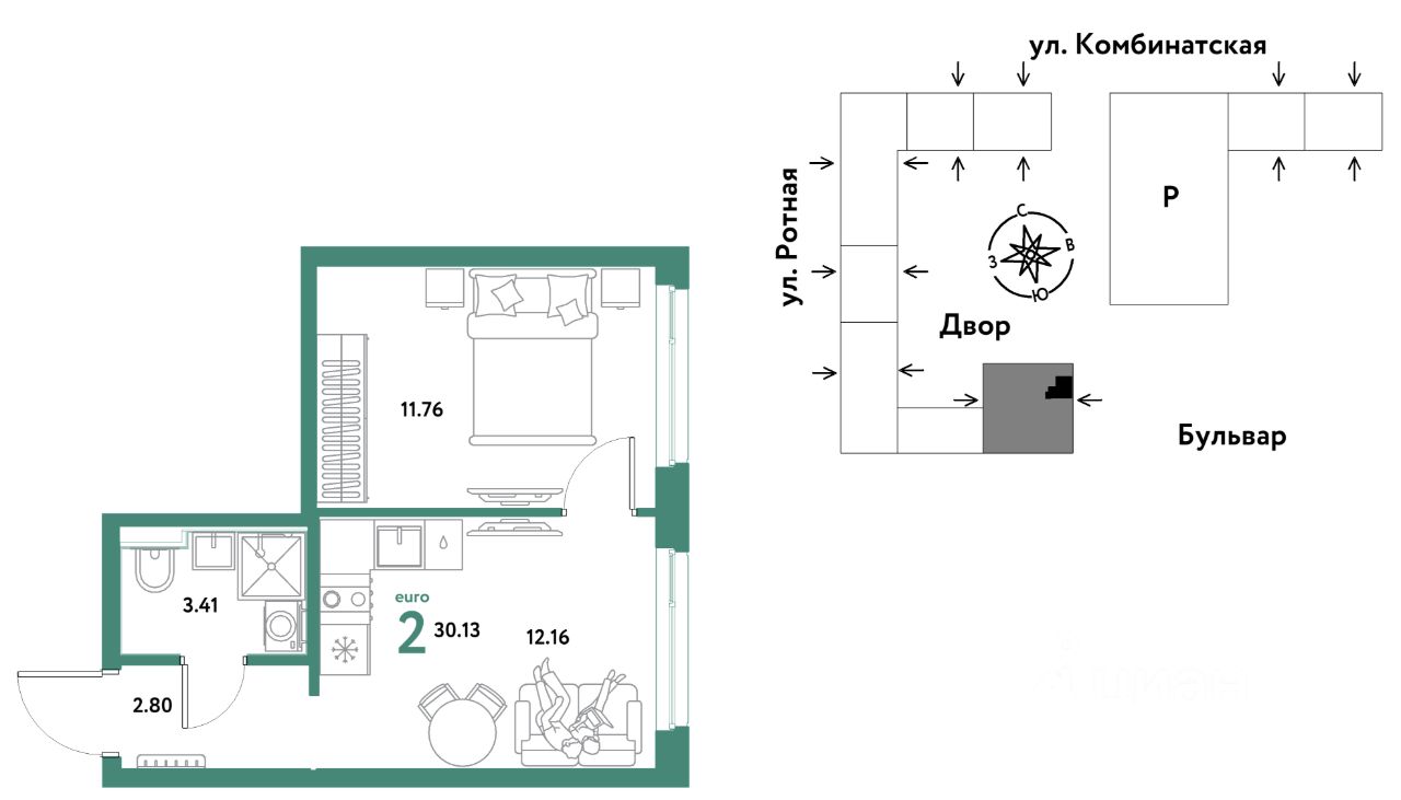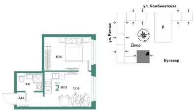 2комнатная квартира площадью 30,13кв. м. на 5 этаже жилого комплекса "Уральский сад".