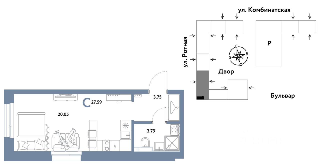 0комнатная квартира площадью 27,59кв. м. на 4 этаже жилого комплекса "Уральский сад".