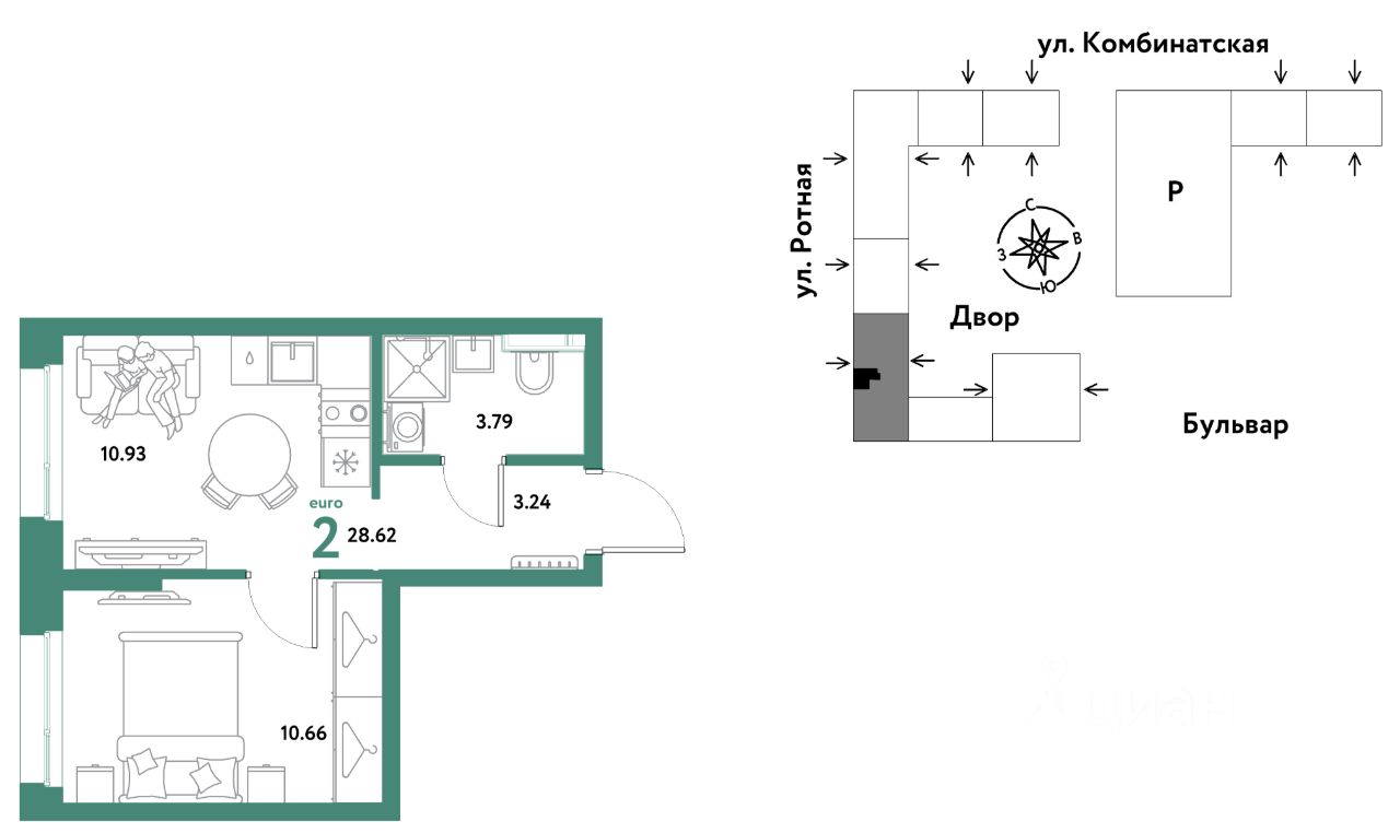 2комнатная квартира площадью 28,62кв. м. на 7 этаже жилого комплекса "Уральский сад".