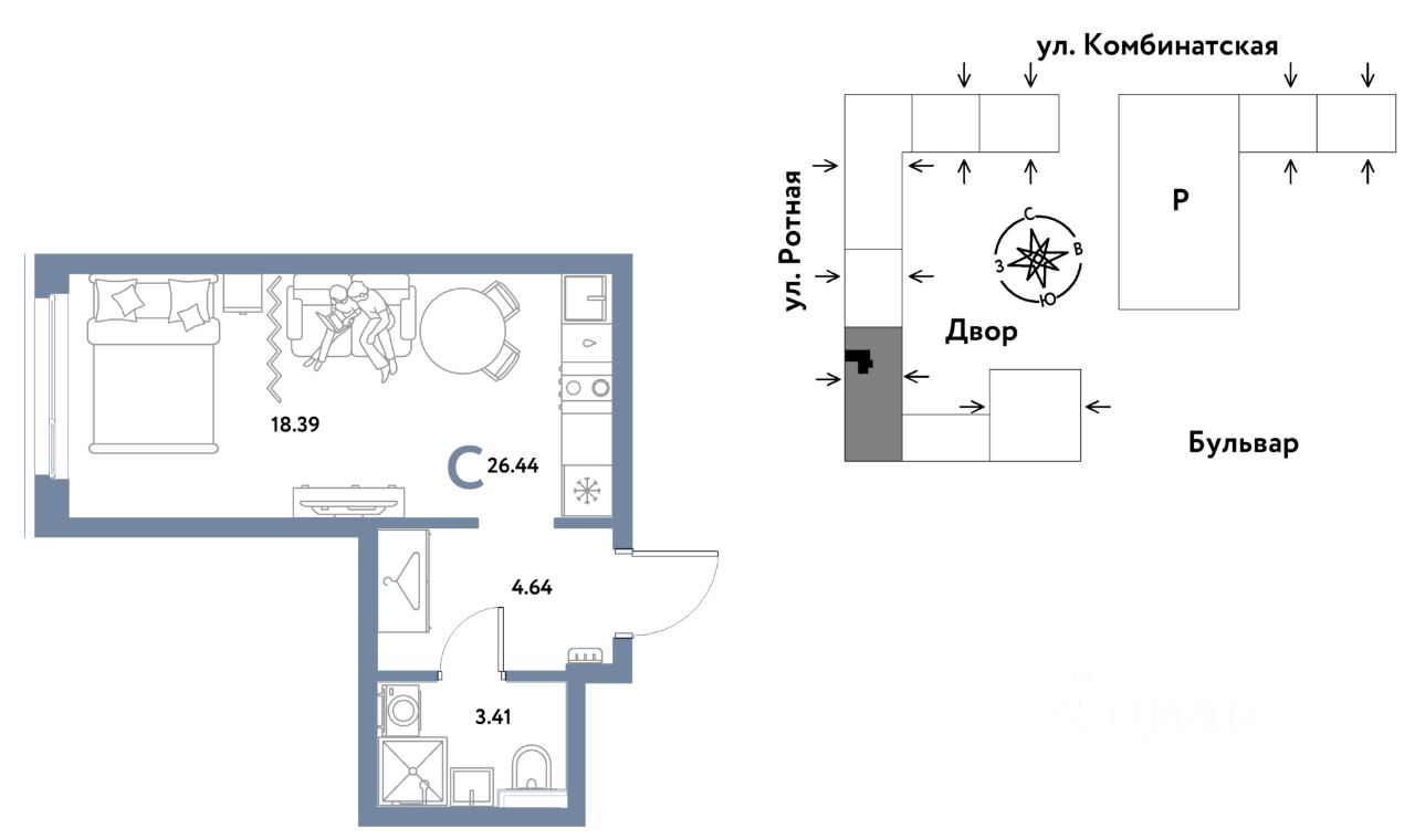 0комнатная квартира площадью 26,44кв. м. на 12 этаже жилого комплекса "Уральский сад".