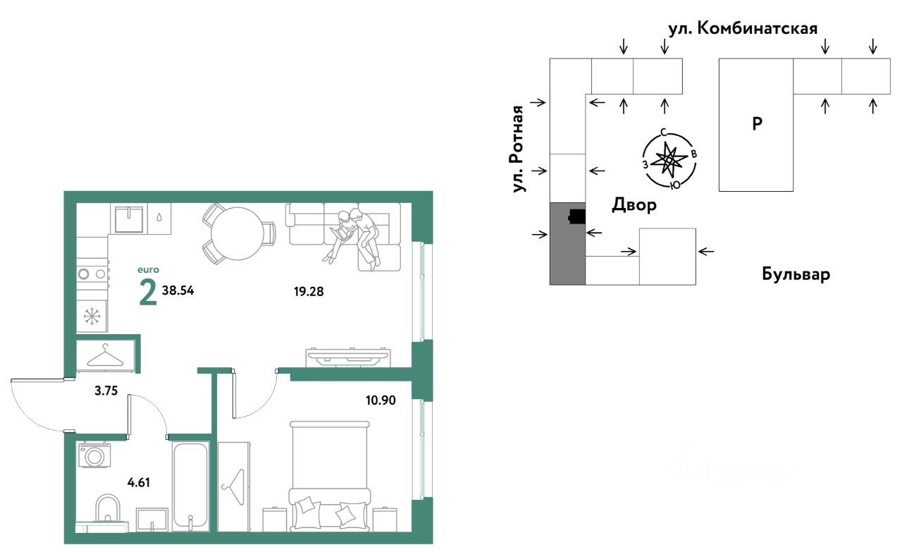 2комнатная квартира площадью 38,54кв. м. на 14 этаже жилого комплекса "Уральский сад".