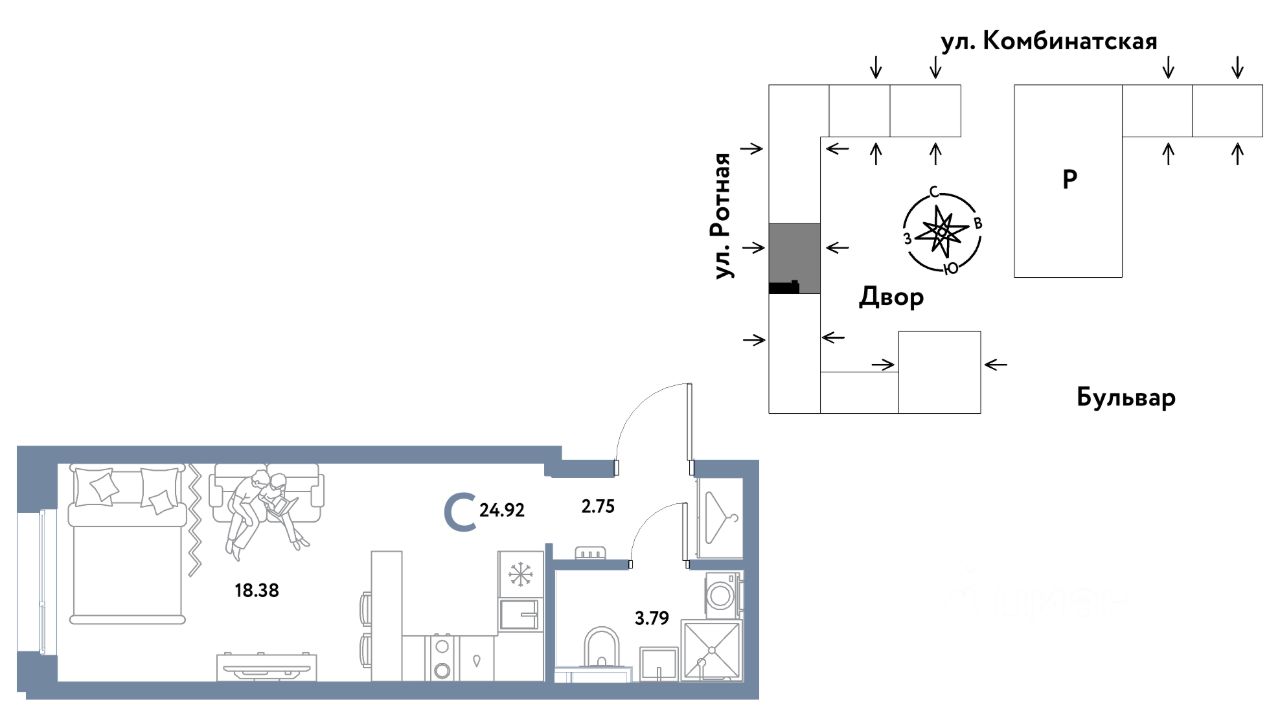 0комнатная квартира площадью 24,92кв. м. на 5 этаже жилого комплекса "Уральский сад".