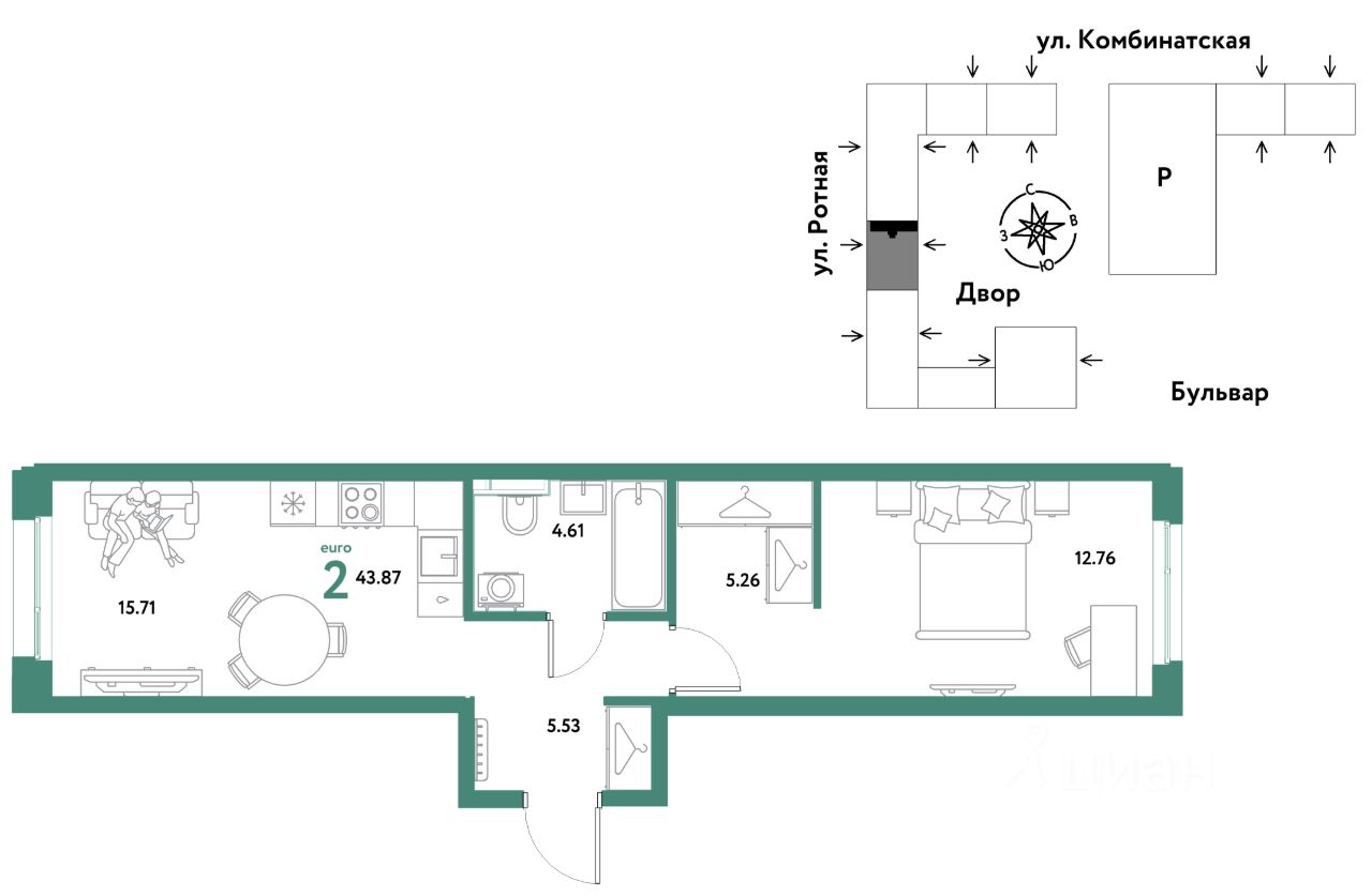 2комнатная квартира площадью 43,87кв. м. на 9 этаже жилого комплекса "Уральский сад".