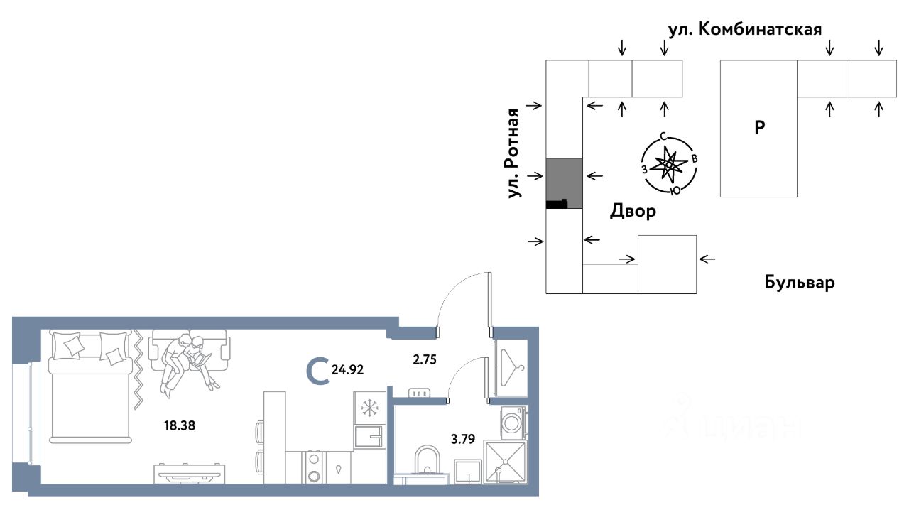 0комнатная квартира площадью 24,92кв. м. на 12 этаже жилого комплекса "Уральский сад".
