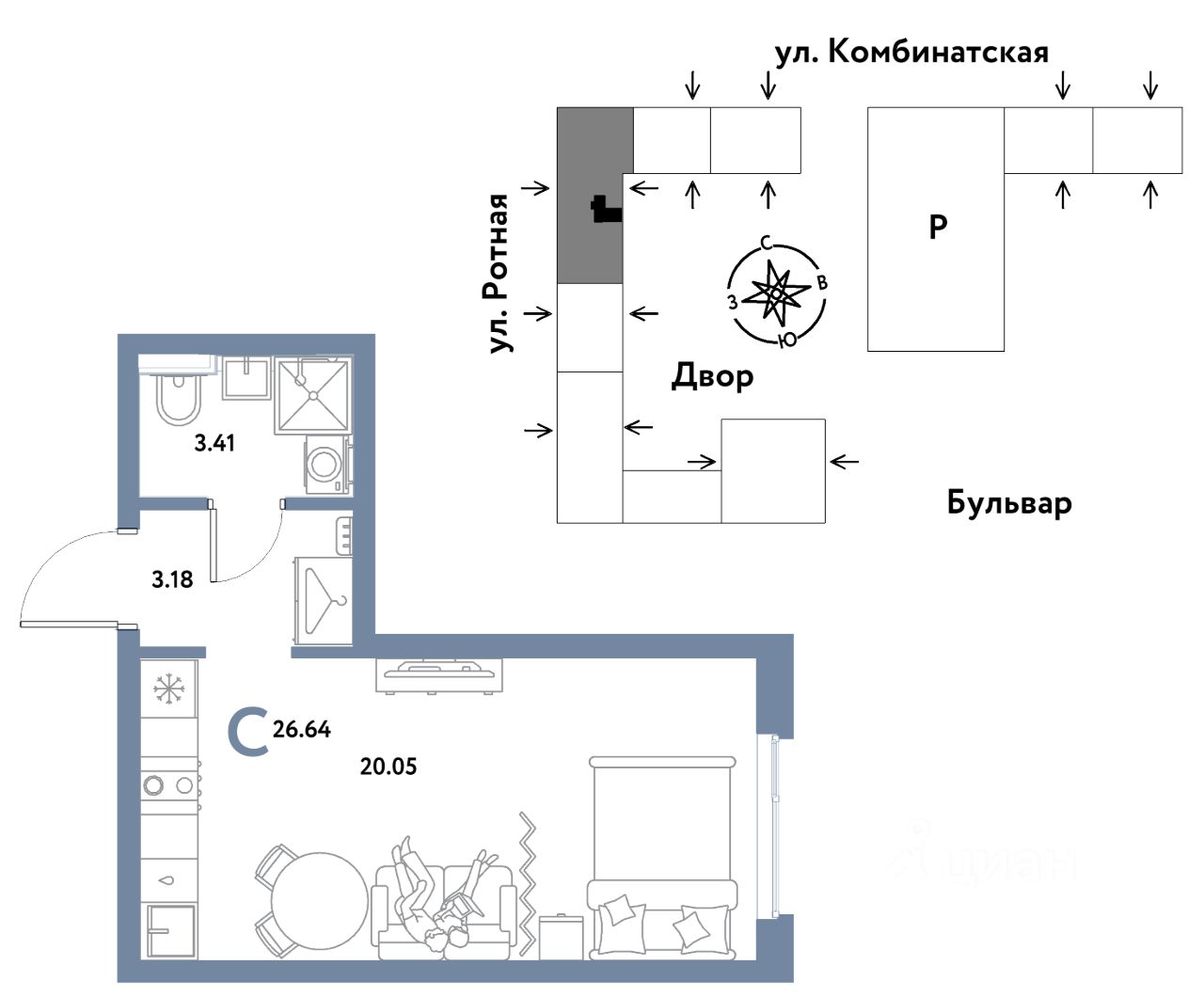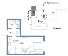 0комнатная квартира площадью 26,64кв. м. на 7 этаже жилого комплекса "Уральский сад".