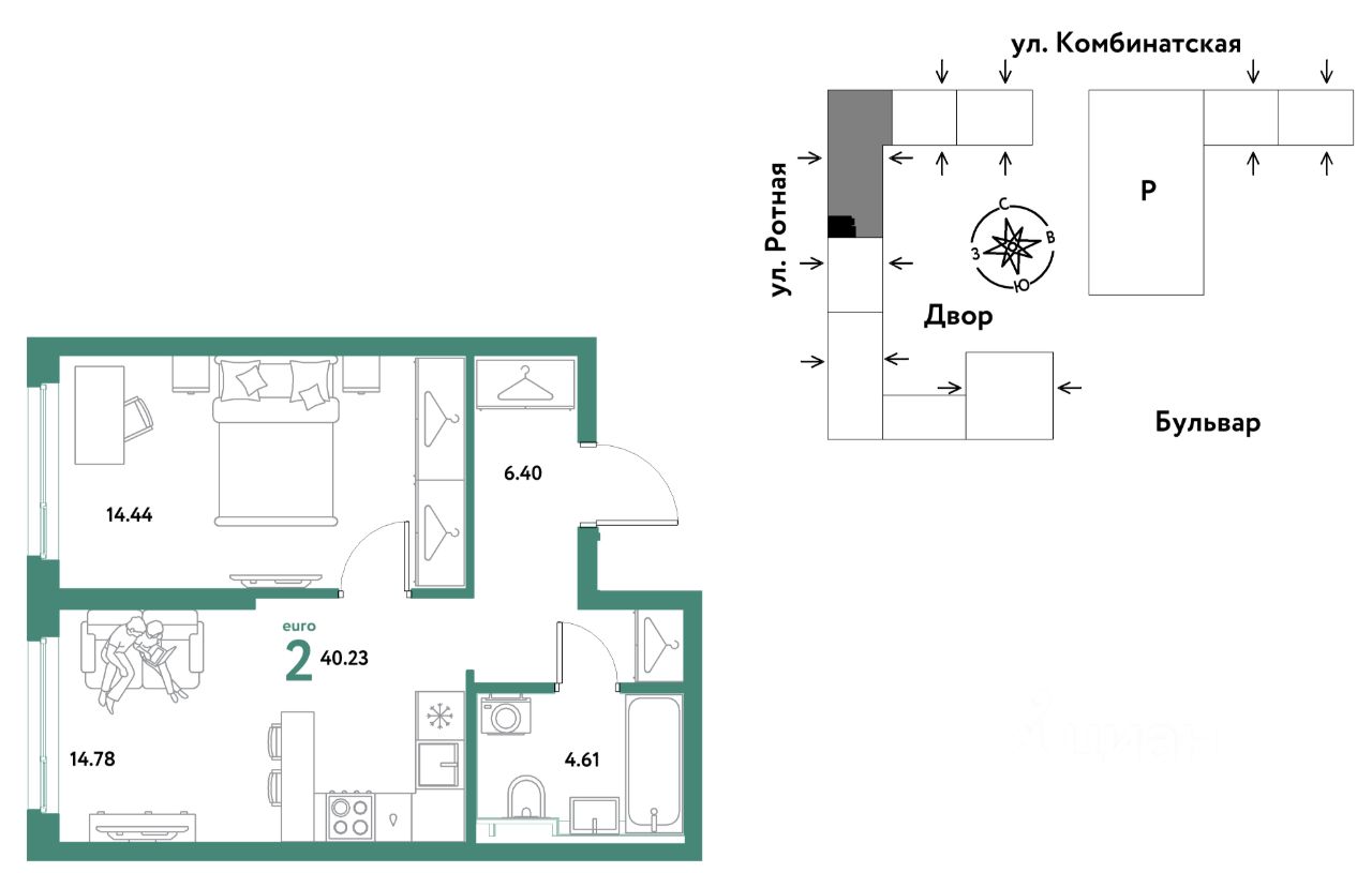 2комнатная квартира площадью 40,23кв. м. на 8 этаже жилого комплекса "Уральский сад".