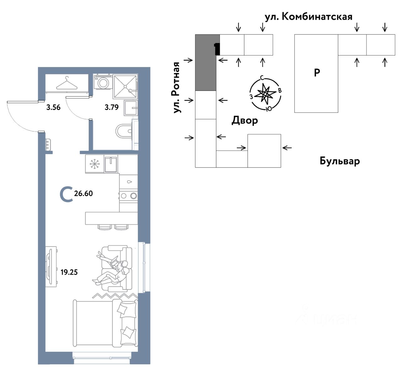 0комнатная квартира площадью 26,6кв. м. на 12 этаже жилого комплекса "Уральский сад".