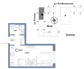 0комнатная квартира площадью 26,64кв. м. на 14 этаже жилого комплекса "Уральский сад".