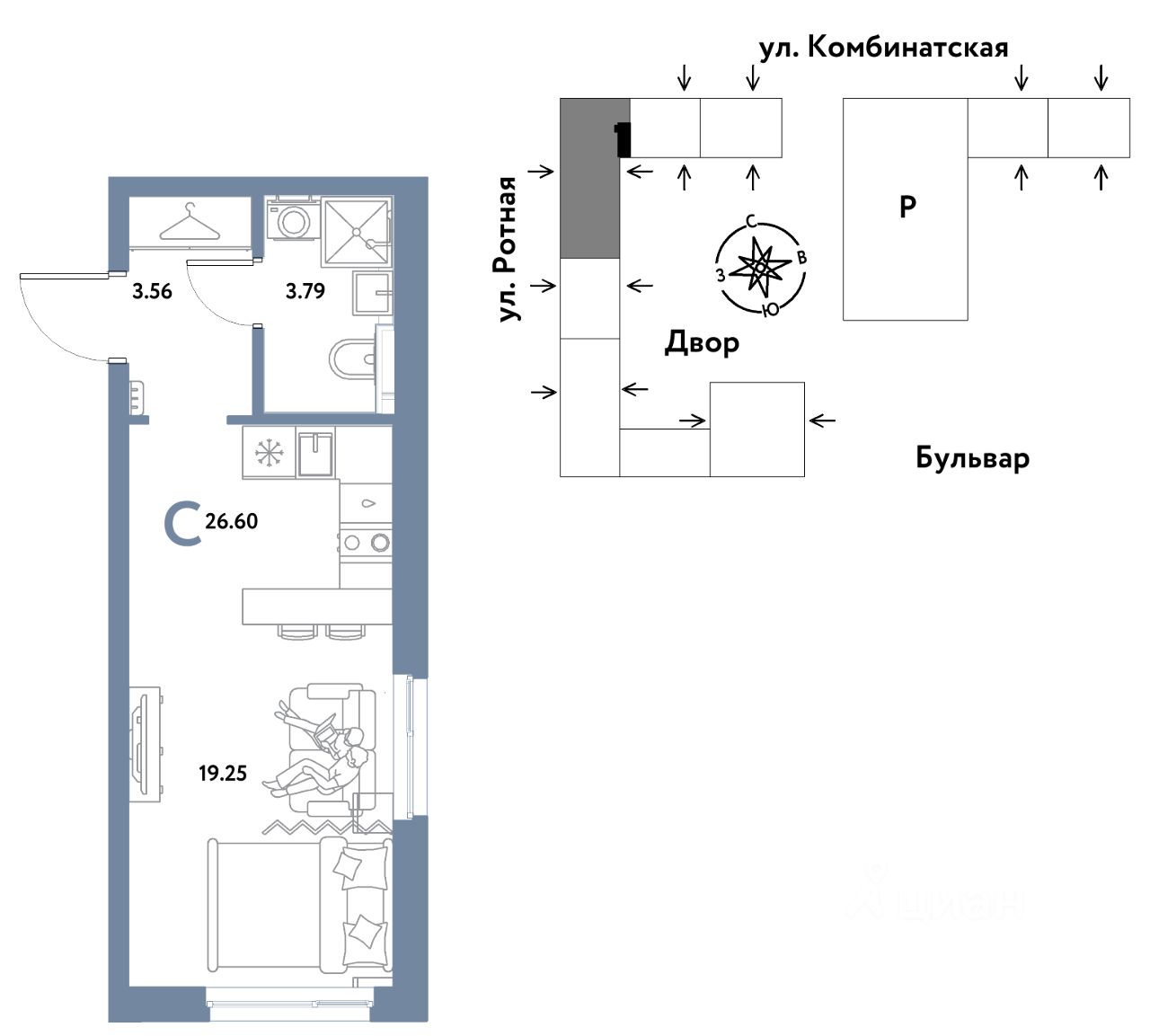 0комнатная квартира площадью 26,6кв. м. на 18 этаже жилого комплекса "Уральский сад".
