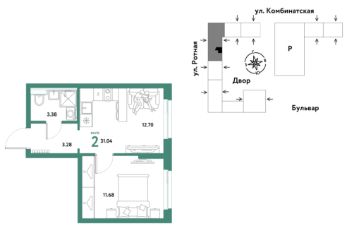 2комнатная квартира площадью 31,04кв. м. на 19 этаже жилого комплекса "Уральский сад".