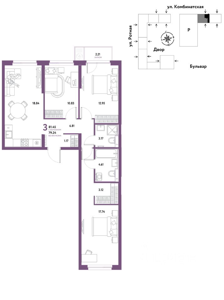 3комнатная квартира площадью 81,45кв. м. на 6 этаже жилого комплекса "Уральский сад".